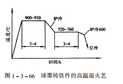2、高溫退火。由于球墨鑄鐵白口傾向較大,因而在鑄態(tài)組織內(nèi)往往存在自由滲碳體。為了使自由滲碳體分解(消除白口),需進(jìn)行高溫退火,見圖 1-3-66。